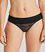 Zomerse zwarte string van Prima Donna. De string heeft aan de voorkant een strook met zwarte broderie van bloemen. Dit geeft een aantrekkelijke uitstraling. Normale heuphoogte en de string bedekt de billen gedeeltelijk.